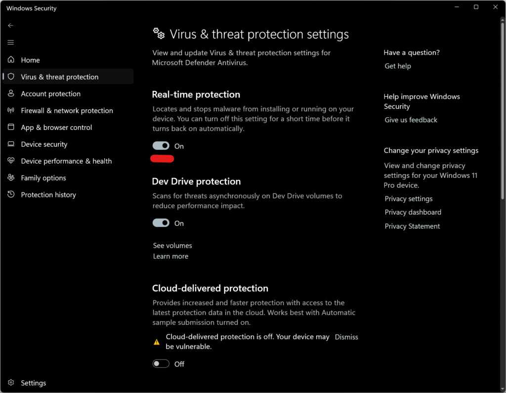 The easiest way of dealing with background AV scanning is simply suspending the protection itself. For Windows 11, you just need to open Windows Security > Virus & threat protection settings and toggle off “Real-time protection.” This action pauses the protection temporarily, allowing forensic tools to operate without interception. However, this state is temporary; Windows Defender automatically reactivates real-time protection upon system reboot, even when manually disabled. Third-party solutions such as Sophos would even automatically reactivate in 4 hours time, creating a narrow time window in which the acquisition must be completed before the defenses re-engage and potentially corrupt the forensic image.